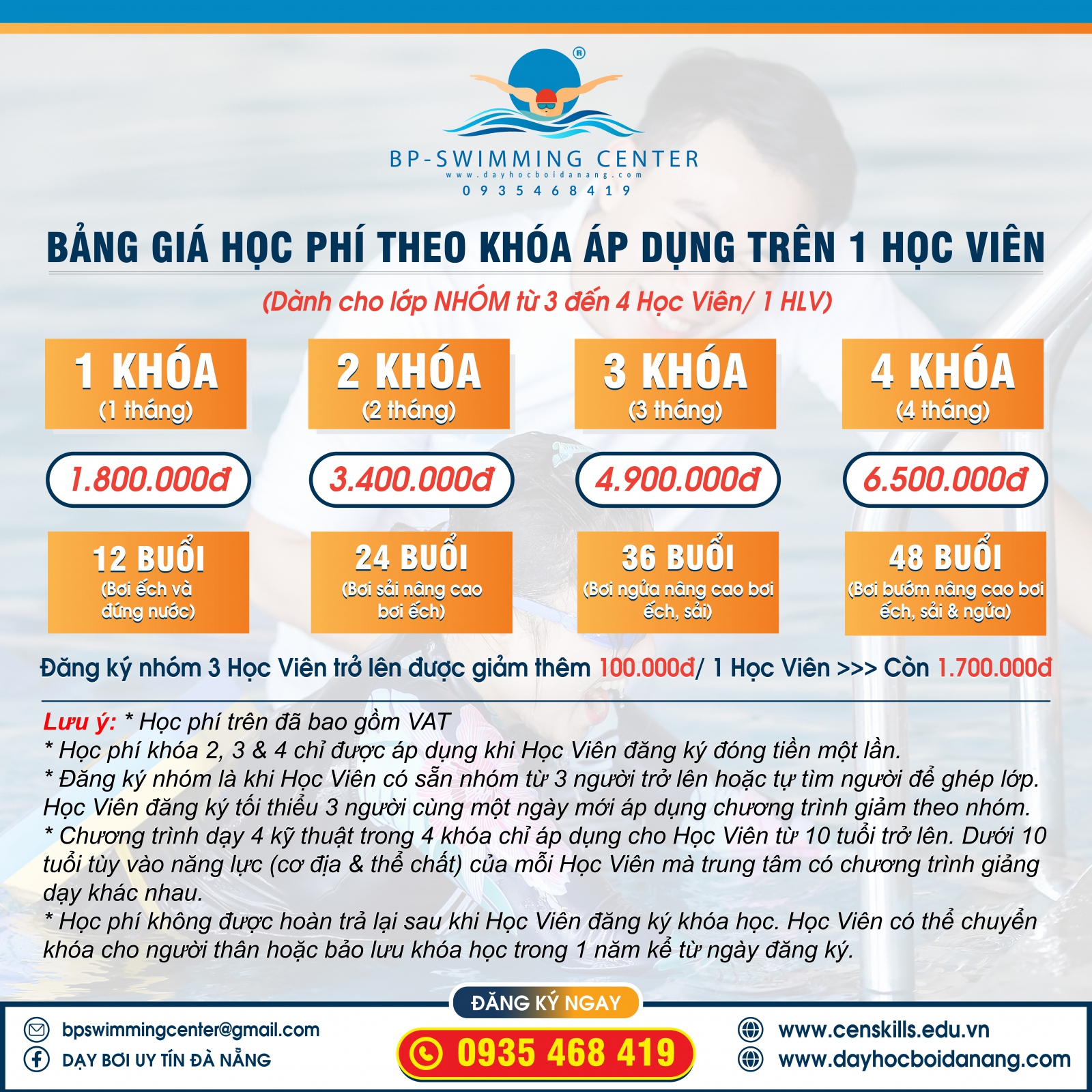 Vì thế, để lựa chọn một trung tâm dạy bơi uy tín giúp gia đình bạn biết bơi nhanh và đúng kỹ thuật. BP - Swimming Center là trung tâm uy tín và đáng tin cậy cho bạn. Đối với tất cả các lớp học bơi cho trẻ em và người lớn Trung tâm dạy kèm cho đến khi nào bạn biết bơi. Trung bình học viên của chúng tôi đã tự bơi được sau 5 đến 7 buổi học. Dạy bơi theo từng kiểu (bơi ếch, bơi sải, bơi ngửa, bơi bướm, dạy đứng nước) đến khi nào bạn bơi thành thục và chuẩn động tác). Hiện tại BP - Swimming Center nhận dạy môn bơi lội từ cơ bản tới nâng cao vào vào tất cả các ngày trong tuần từ thứ 2 đến chủ nhật, từ 06h00 đến 20h00 tại Đà Nẵng. Ngoài dạy các kiểu bơi bạn còn được học đầy đủ các kỹ năng như thở nước, lướt nước, đứng nước, cách xử lý tình huống bất ngờ.